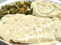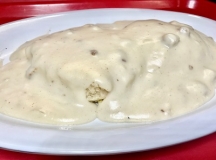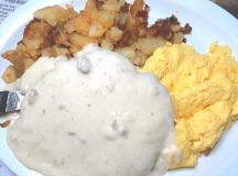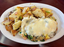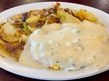 Two Biscuit Halves Topped with Sausage and Covered with County Gravy, 2 Eggs & Home Fries