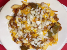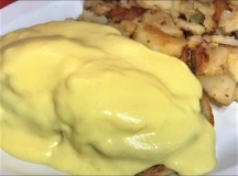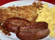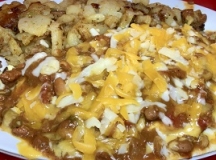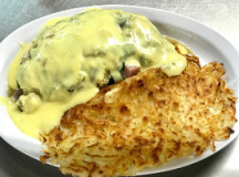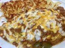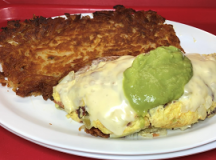 Tortilla Topped with Home Fries, 2 Eggs Over Medium and Cheese, Covered with Spanish Sauce & Surrounded with Sausage